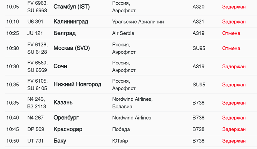 Большинство самолетов, которые должны были приземлиться после 8 утра ожидаются только после 11:30, соответственно сдвигается и время отправки бортов. Но пока отставание от графика не превышает 4 часов. Среди отменных 2S-115 авиакомпании Southwind Airlines в Анталью и JU-121 Air Serbia в Белград.